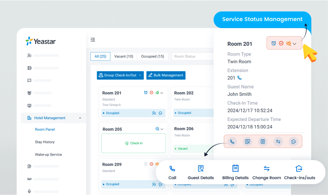 The Hotel Management module turns Yeastar P-Series Phone System an active part of your hotel management. It brings a powerful suite of hospitality features and allows real-time management of room assignments, guest check-ins/outs, and other day-to-day hotel operations with intuitive service panels. Ideal for small and medium hotels to realise systematic property control without breaking the bank.